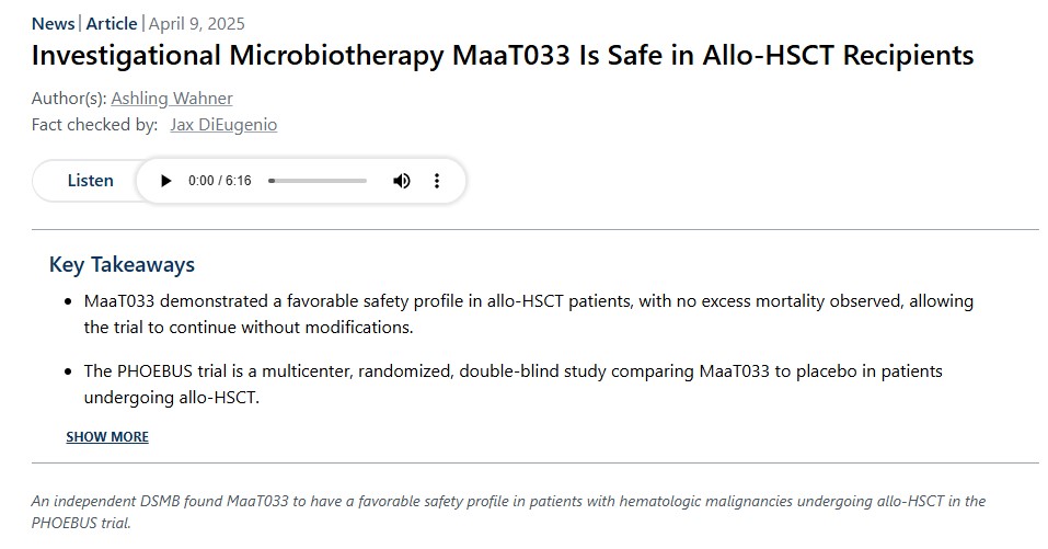 Next PostApril 8, 2025: MaaT Pharma Announces Positive Safety Interim Analysis from DSMB for Phase 2b Trial Evaluating MaaT033 for Patients Receiving Allo-HSCT