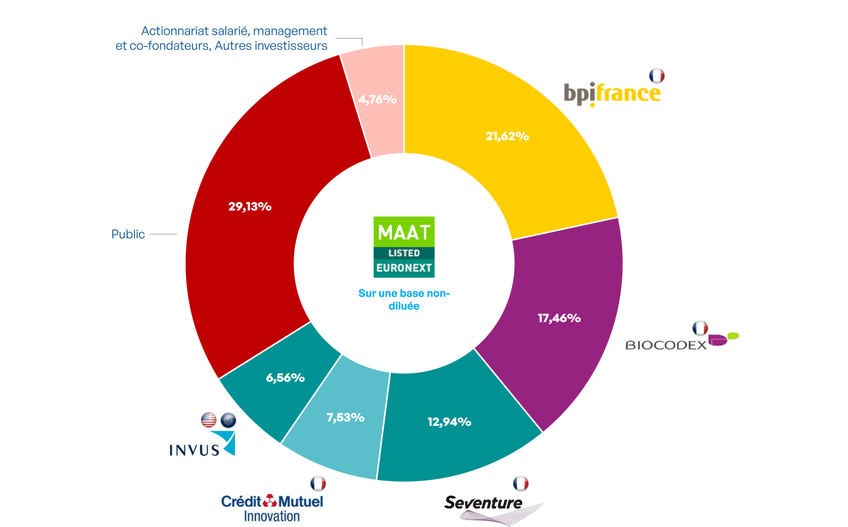 MaaT Pharma est une société de biotechnologie en phase clinique avancée, leader dans le développement de médicaments issus du microbiote intestinal dédiés à moduler le système immunitaire des patients atteints de cancer et à améliorer leur survie. Soutenue par une équipe experte qui s’engage à faire la différence pour les patients du monde entier, la Société a été fondée en 2014 et est basée à Lyon en France. Pionnière dans son domaine, MaaT Pharma a franchi en janvier 2025 une étape majeure dans son développement avec des résultats principaux positifs pour son essai clinique de Phase 3 évaluant son candidat-médicament immunomodulateur basé sur le microbiote intestinal en oncologie. Grâce à ses technologies propriétaires de « pooling » (combinaison de dons de microbiotes sains) et de co-culture microbienne, MaaT Pharma développe des médicaments standardisés à haute diversité bactérienne, visant à améliorer la survie des patients atteints de cancer. MaaT Pharma est cotée sur Euronext Paris (MAAT) depuis 2021.