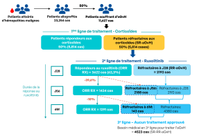 Lorsque les premiers signes de la maladie du greffon contre l’hôte (GvH) apparaissent après une allogreffe de cellules souches, le traitement de première intention repose généralement sur l’usage de corticoïdes. Ces médicaments permettent, dans certains cas, de contrôler l’inflammation et de limiter les attaques du système immunitaire. Pour ces patients, un traitement par immunothérapie peut être envisagé, mais les options restent encore limitées et l’efficacité variable.