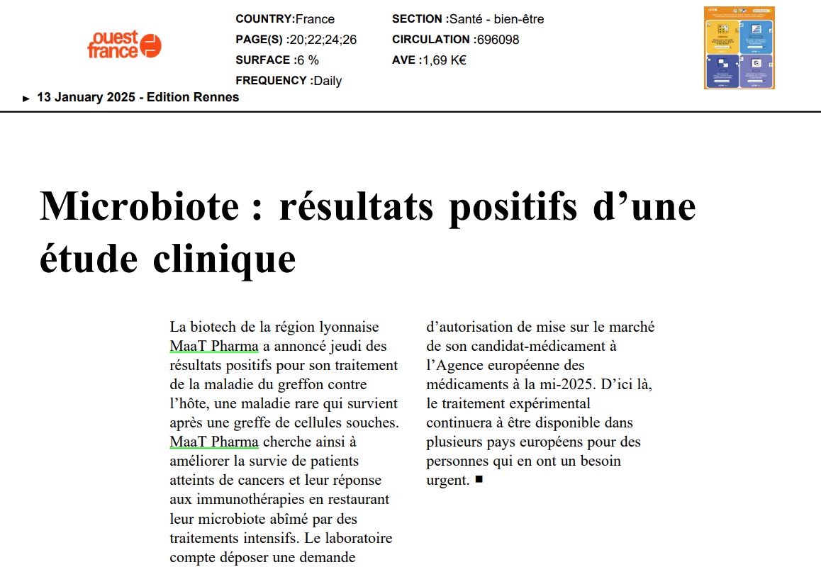 January 13, 2025: Microbiote : résultats positifs d’une étude clinique – Ouest France (French Only)