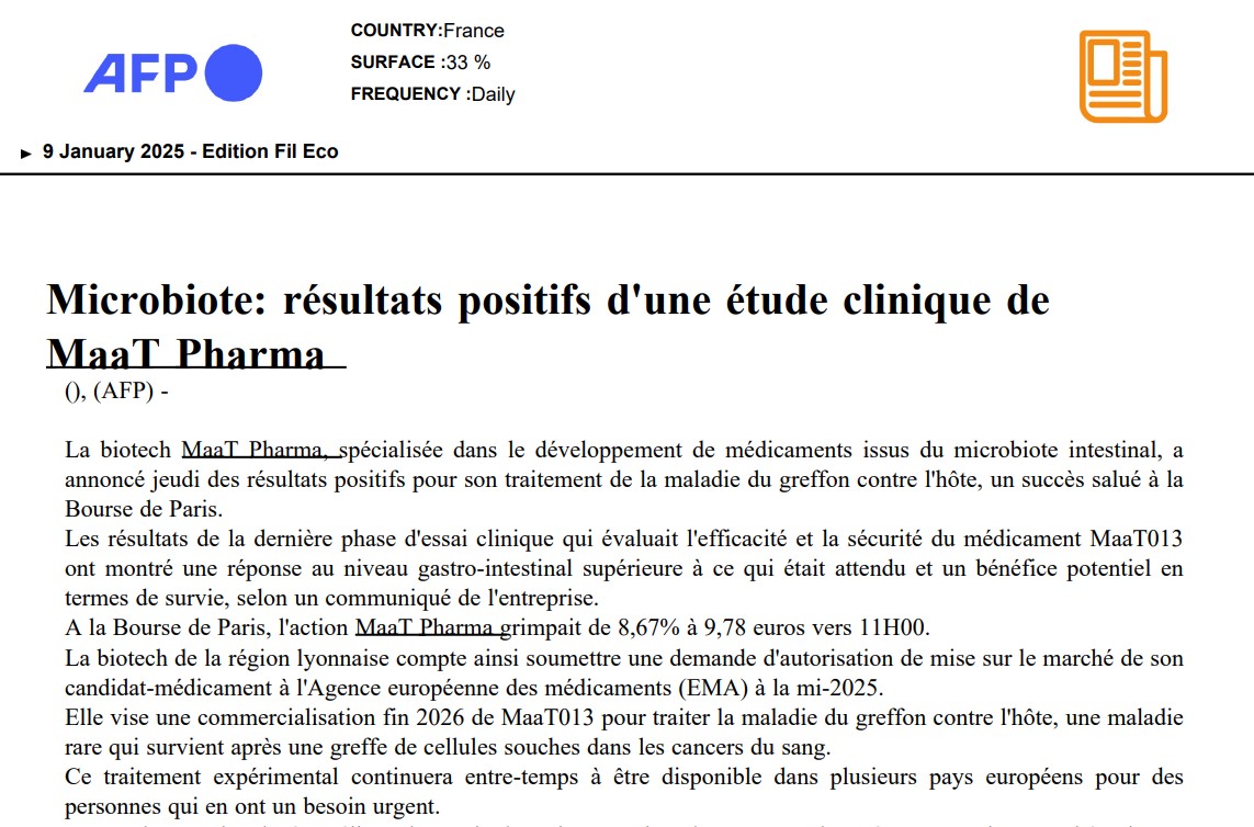 January 9, 2025: Microbiote: résultats positifs d’une étude clinique de MaaT Pharma – Agence France Presse (French Only)