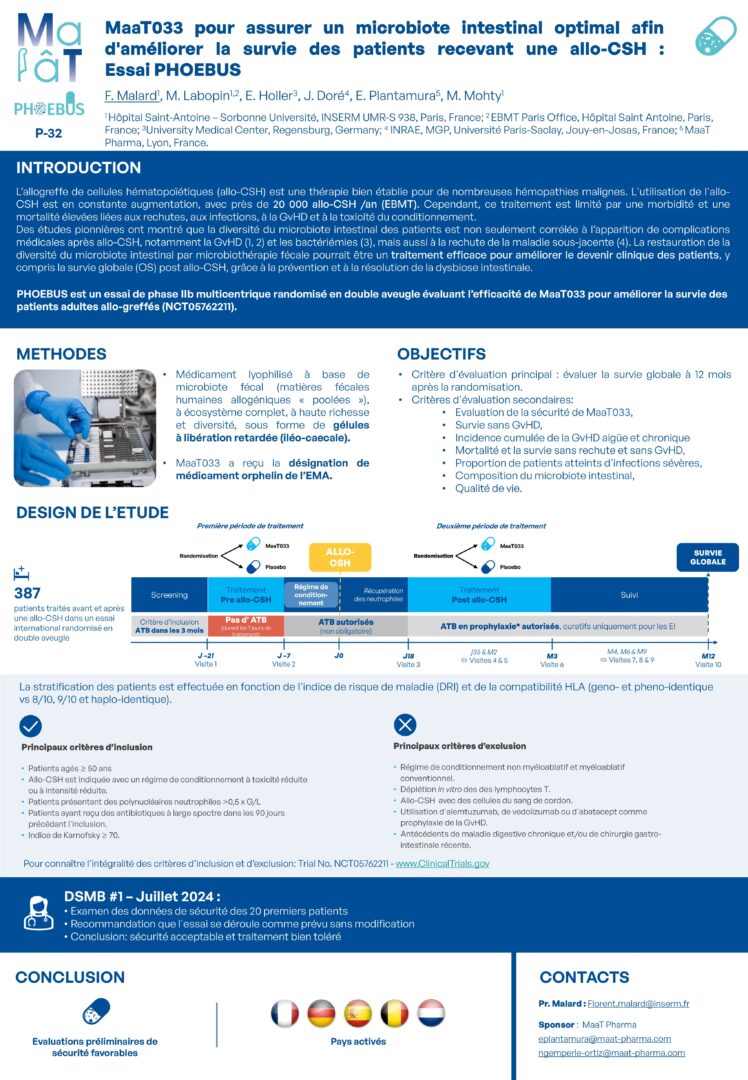 PHOEBUS Trial: an international, randomized, double-blind, multicenter phase IIb study evaluating MaaT033, oral allogeneic fecal microbiotherapy, in patients undergoing allo-HSCT to improve overall survival. SEHH Congress (Spanish only)