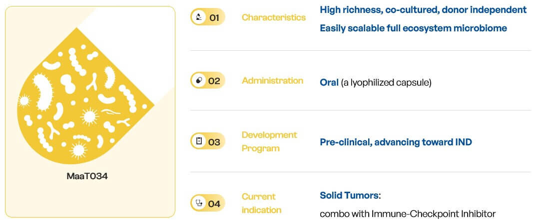 MaaT034, the first-in-class co-cultured product, is aiming at optimizing intestinal microbiome functions prior to and during immunotherapy in major oncology indications, and become a (neo)-adjuvant therapy across ICI therapies, leading to better survival in cancer patients. The objective of MaaT Pharma is to develop MaaT034 as tumor-agnostic adjunctive therapies to ICI (i.e. administration before and in combination with ICI whatever the type of cancer) leading to improved clinical outcomes and lower incidence of complications than using ICI alone.