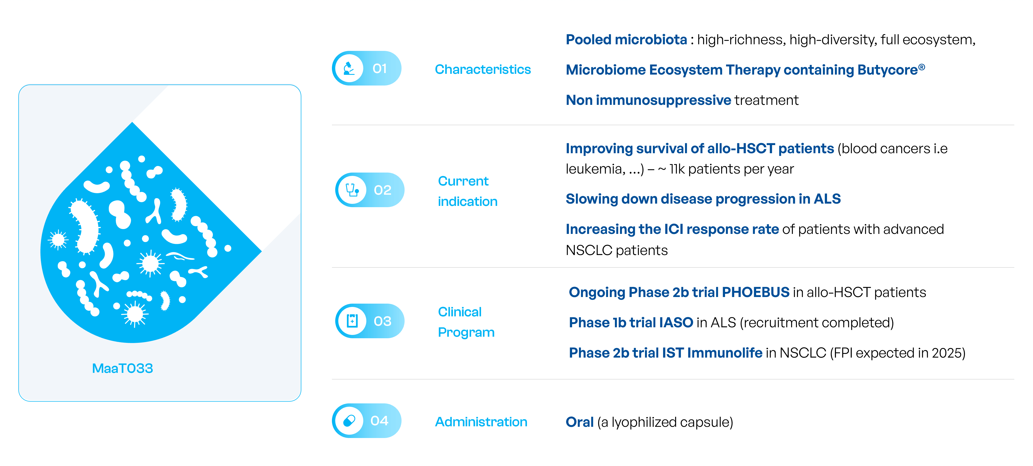 - Key study endpoints: assess safety and tolerability of MaaT033 and gut microbiota composition evolution