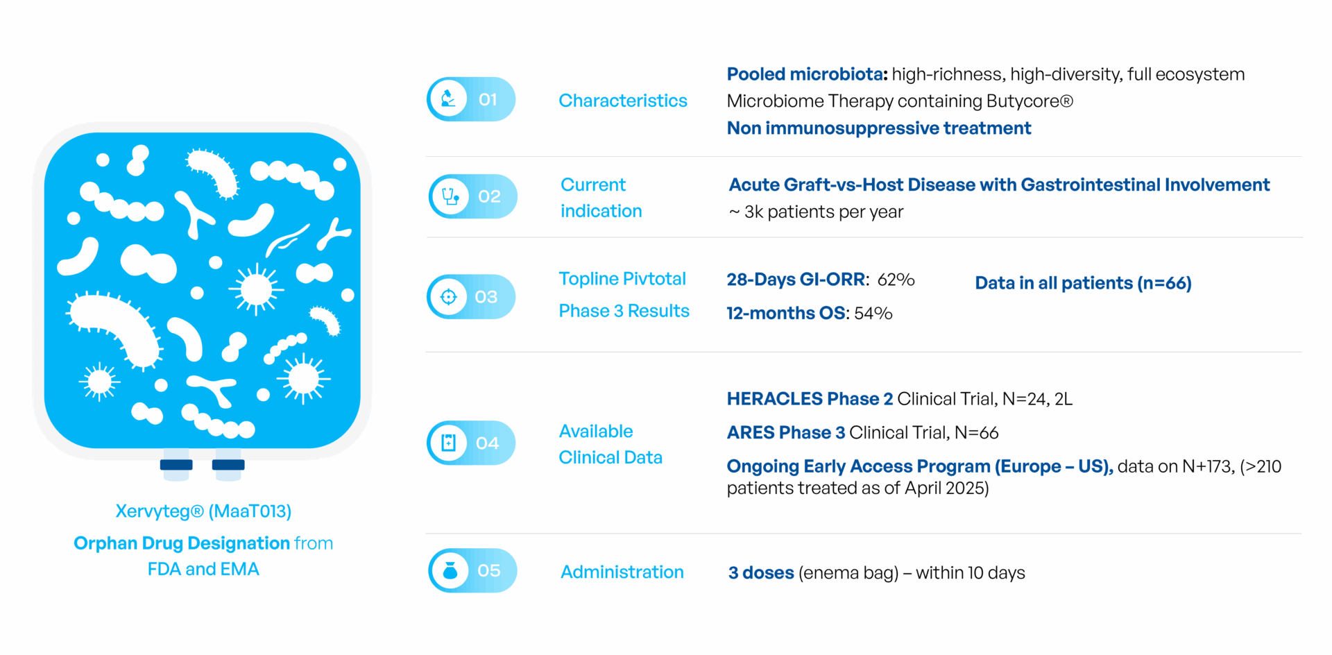 Xervyteg® (MaaT013) is a microbiota-based therapeutic currently under regulatory review in Europe for the treatment of gastrointestinal acute Graft-versus-Host Disease (GI-aGvHD). The therapy has been evaluated in the pivotal Phase 3 ARES clinical trial (NCT04769895), the first global Phase 3 study of a microbiome-based therapy in hemato-oncology.