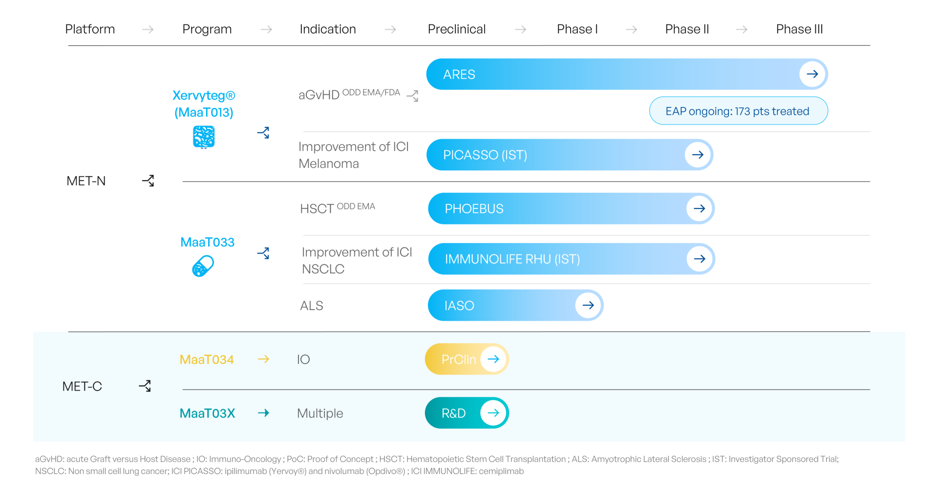 To achieve this, MaaT Pharma will capitalize on MET-N products: an Investigator-Sponsored Trial (IST) is already ongoing in solid tumors with the PICASSO trial (metastatic melanoma, with Xervyteg®MaaT013) to evaluate the safety of MET-N products in combination with ICI and collect preliminary efficacy data assessing the impact of MET products on the immune system and anti-tumoral responses.
