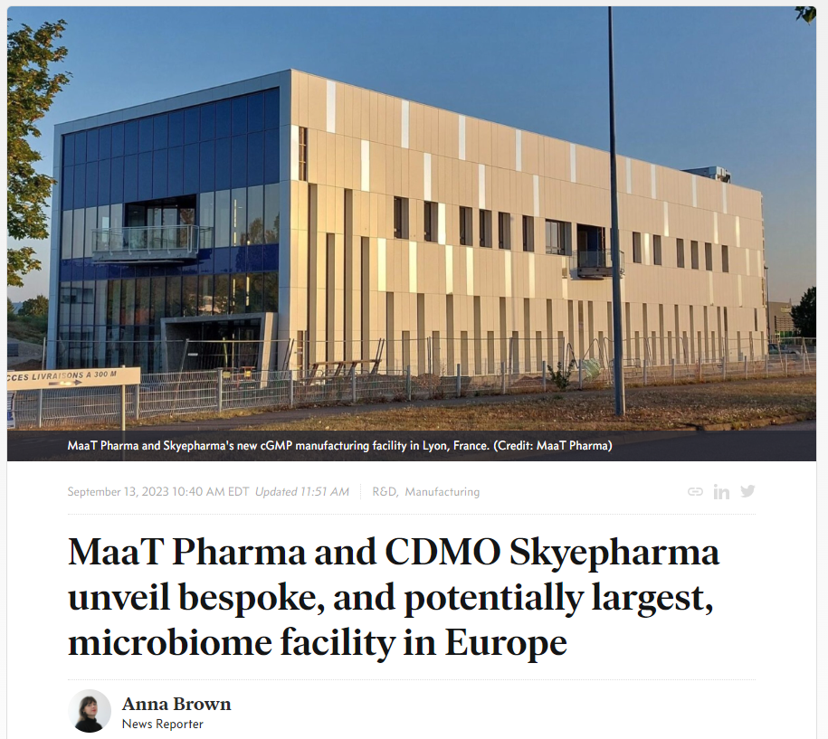 Next PostSeptember 12, 2023: MaaT Pharma and Skyepharma Complete Construction of Europe’s Largest Manufacturing Facility for Microbiome Ecosystem Therapies